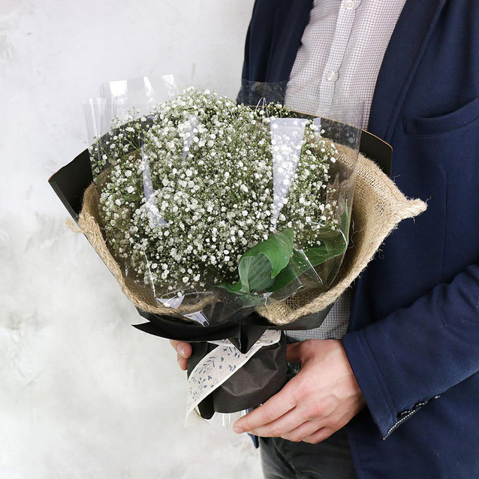 Авторский букет из гипсофил и листьев хоста в оригинальной упаковке
