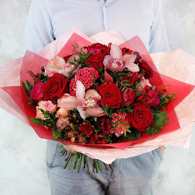 Бизнес букет из роз, альстромерий и орхидей в оригинальной упаковке