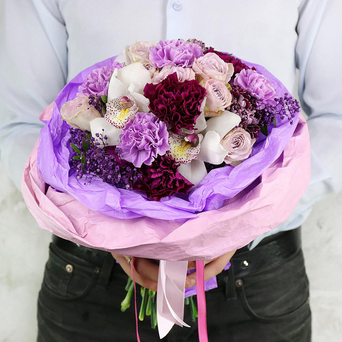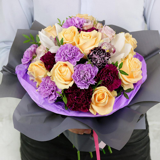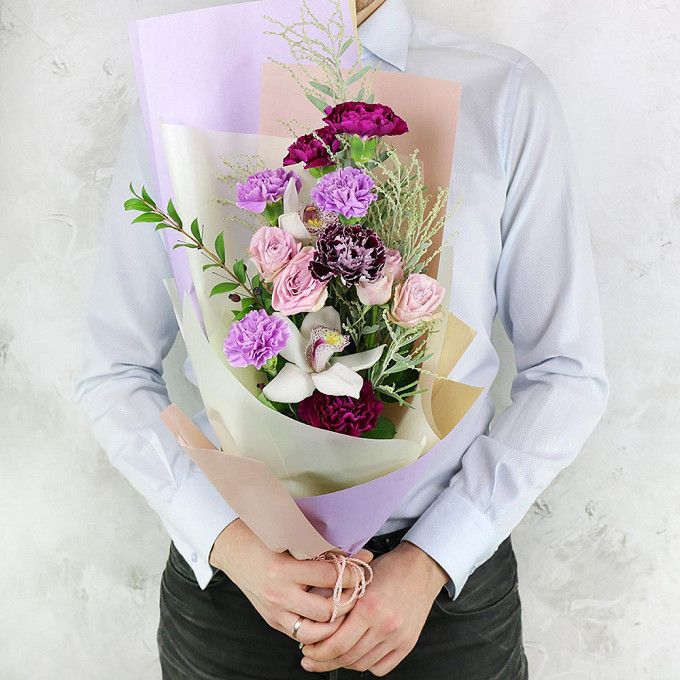 Букет из гвоздик, кустовых роз и орхидей