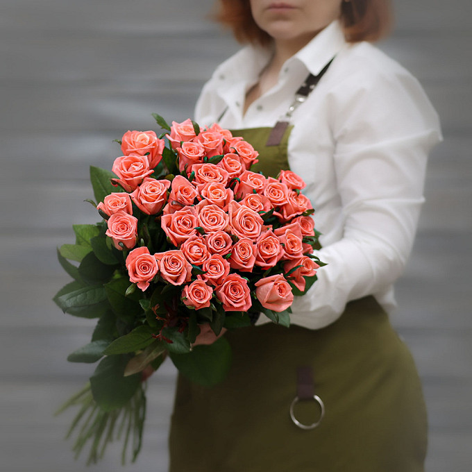 Букет из 33 коралловых роз (Россия) с лентой 60 см