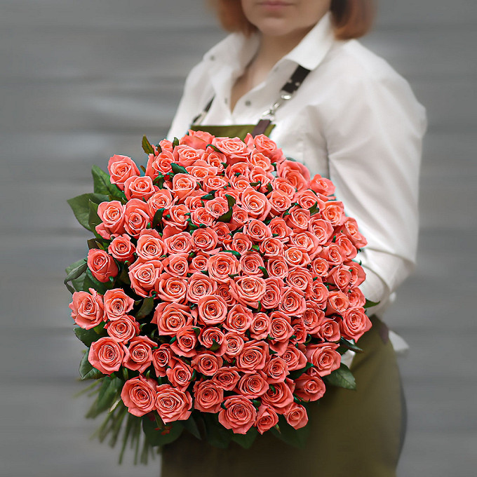 Букет из 101 коралловой розы (Россия) с лентой 60 см